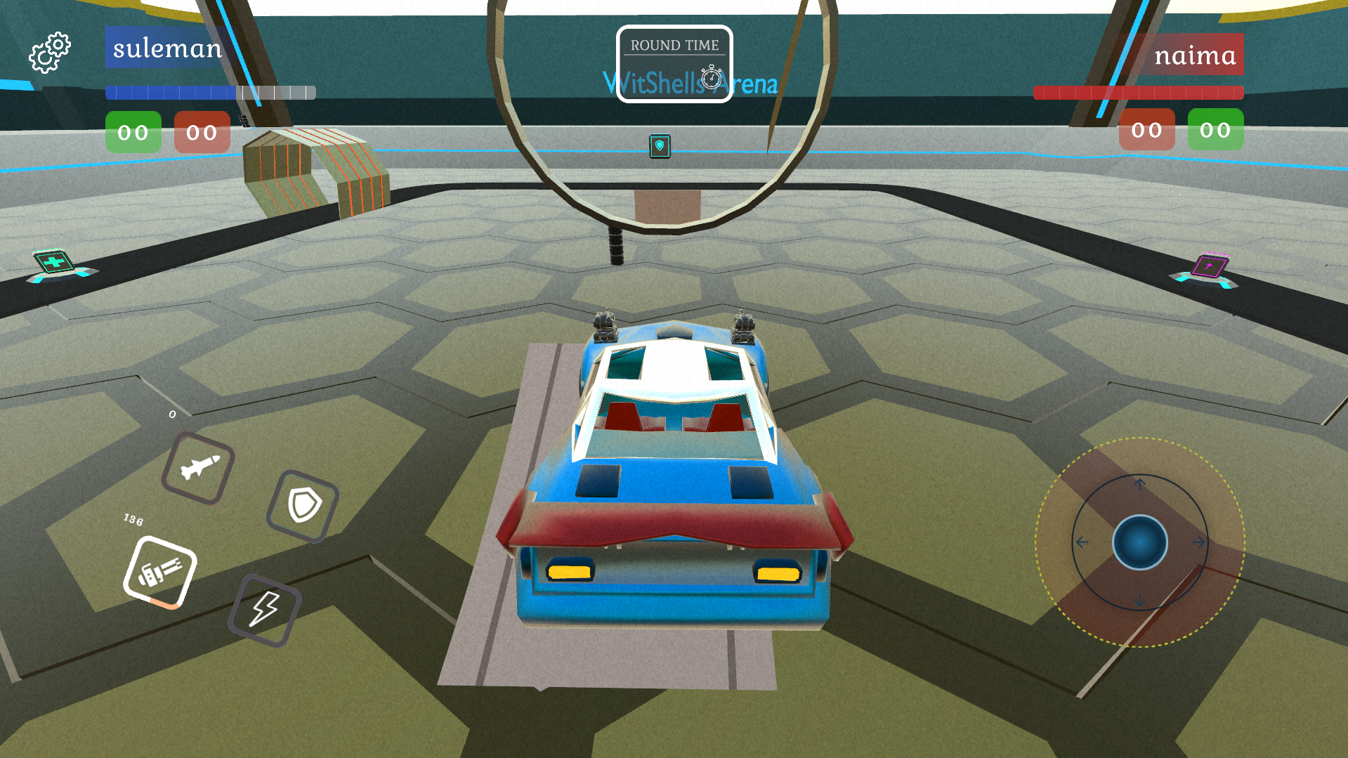 Scatter across a hexagonal industrial arena, grab weapon modules, defense systems, and special abilities from pickup pads on the ground. Every slot you claim disappears from the field — what you grab is yours, what you miss is theirs. In seconds, two empty cars transform into two very different machines with very different strategies.